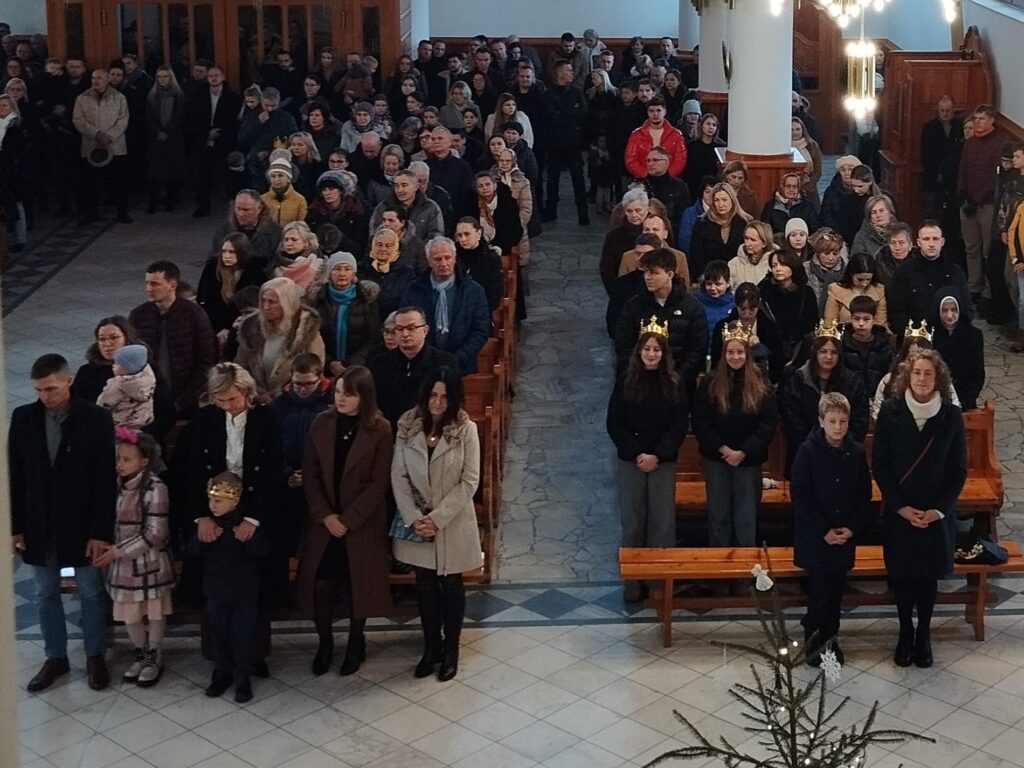 We wtorek 6 stycznia przeżywaliśmy uroczystość Objawienia Pańskiego. Na pamiątkę pokłonu Mędrców ze Wschodu, również w naszej parafii odbył się Orszak Trzech Króli. Uczestnicy zgromadzili się przy Żywej Szopce przy Starej Plebanii. Ksiądz Proboszcz Tadeusz Korczak przywitał wszystkich – Trzech Króli oraz przybyłe rodziny naszej parafii, w tym dzieci w koronach na głowie. Po odczytaniu fragmentu z Ewangelii wg św. Mateusza, orszak wyruszył w stronę kościoła z radosnym śpiewem. Przy żłóbku królowie złożyli swoje dary: złoto, kadzidło i mirrę. Następnie rozpoczęła się uroczysta Eucharystia.